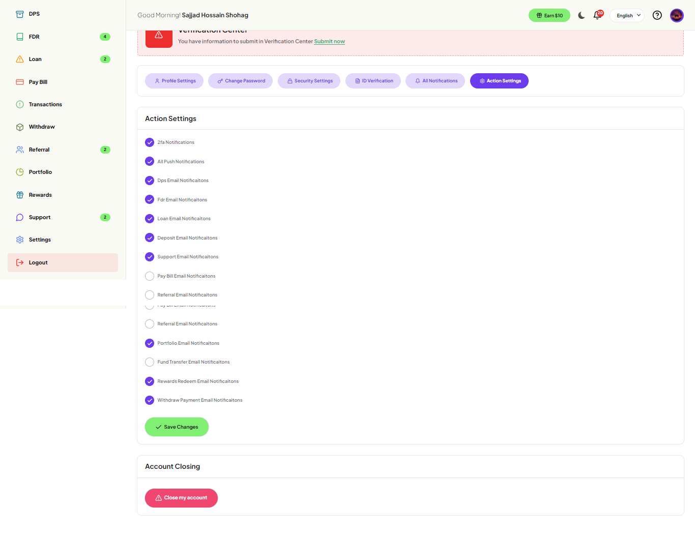 In the Action Settings page, User can enabled/disabled notifications and account closing from
