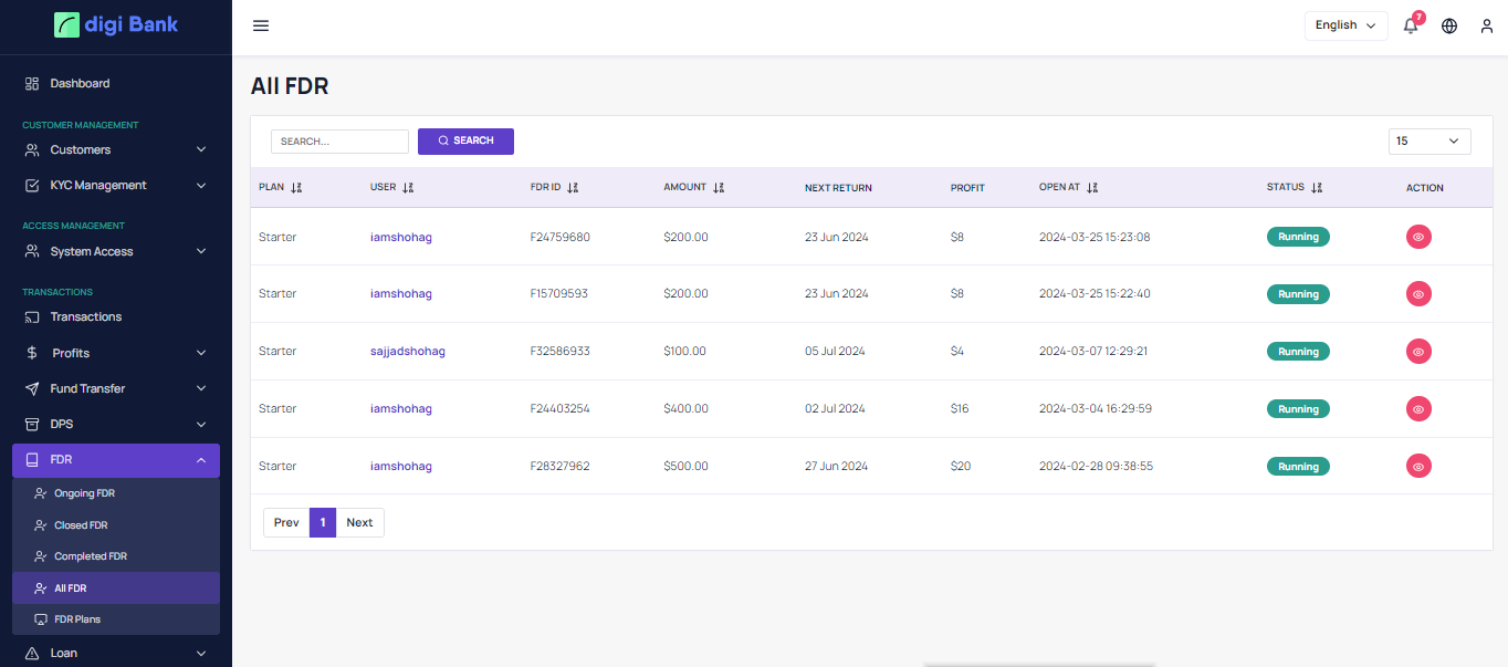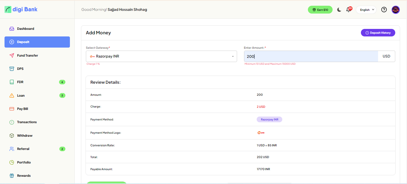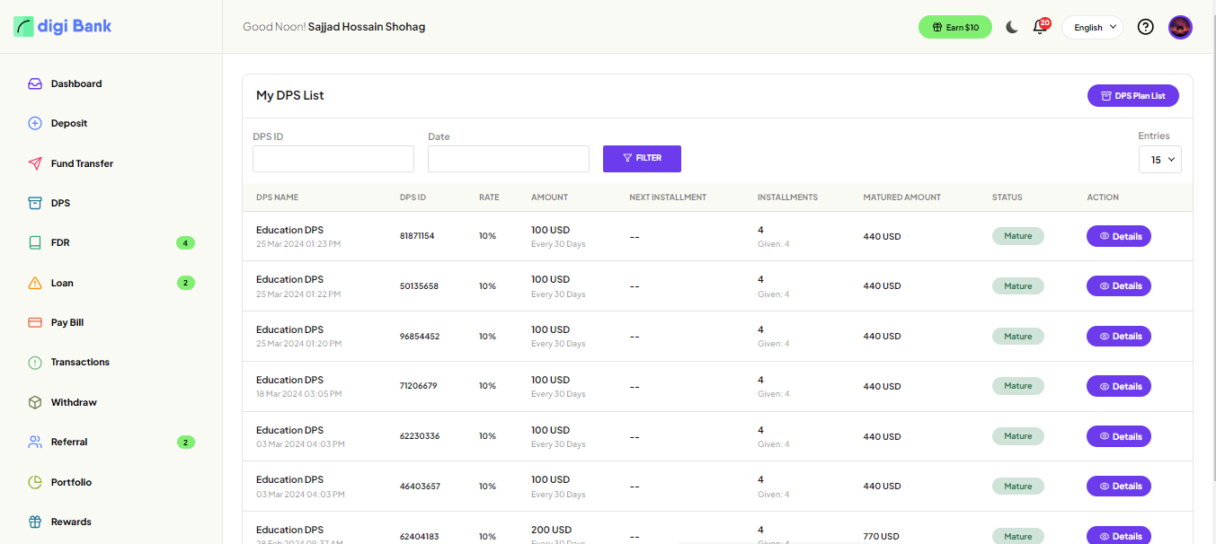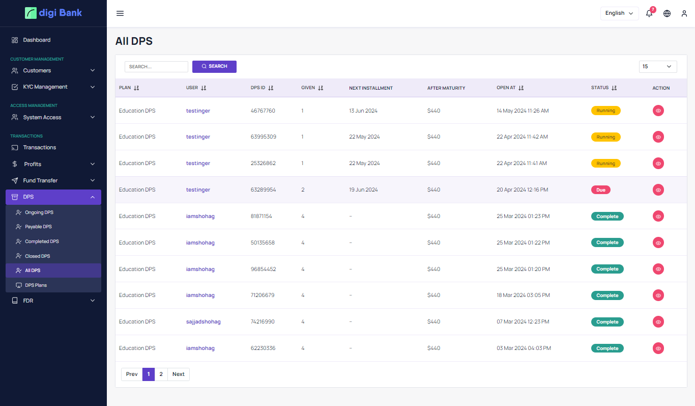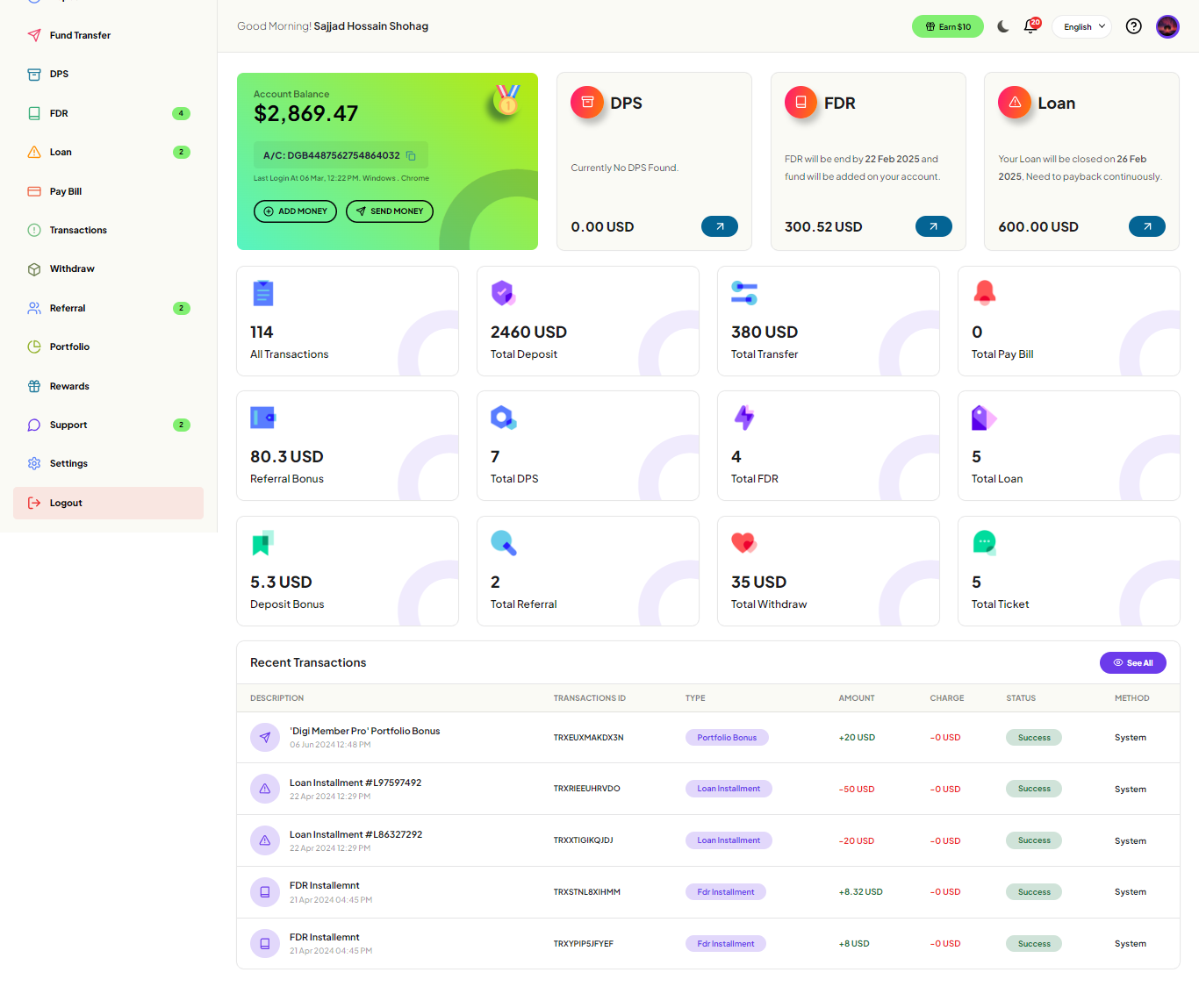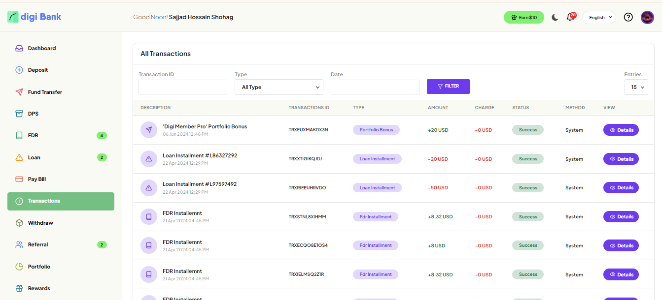 amount. In the system, there are DPS, FDR and, Loan and Bill payment features available. The