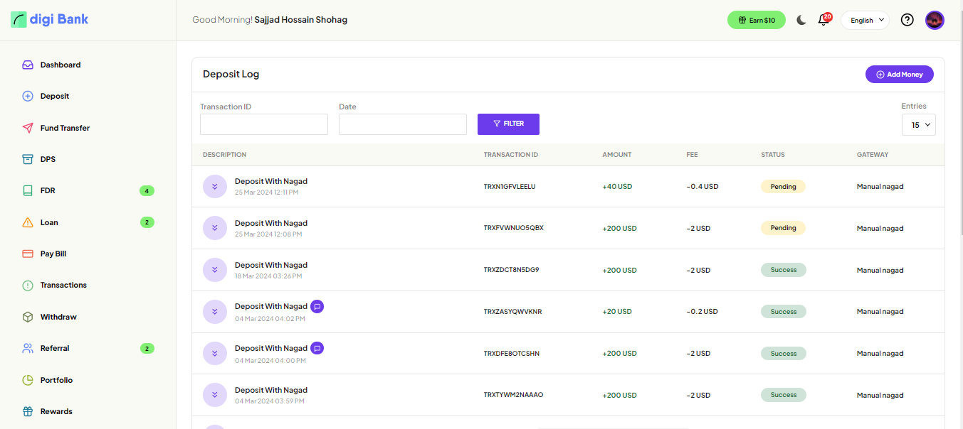 User can explore all the deposit history here