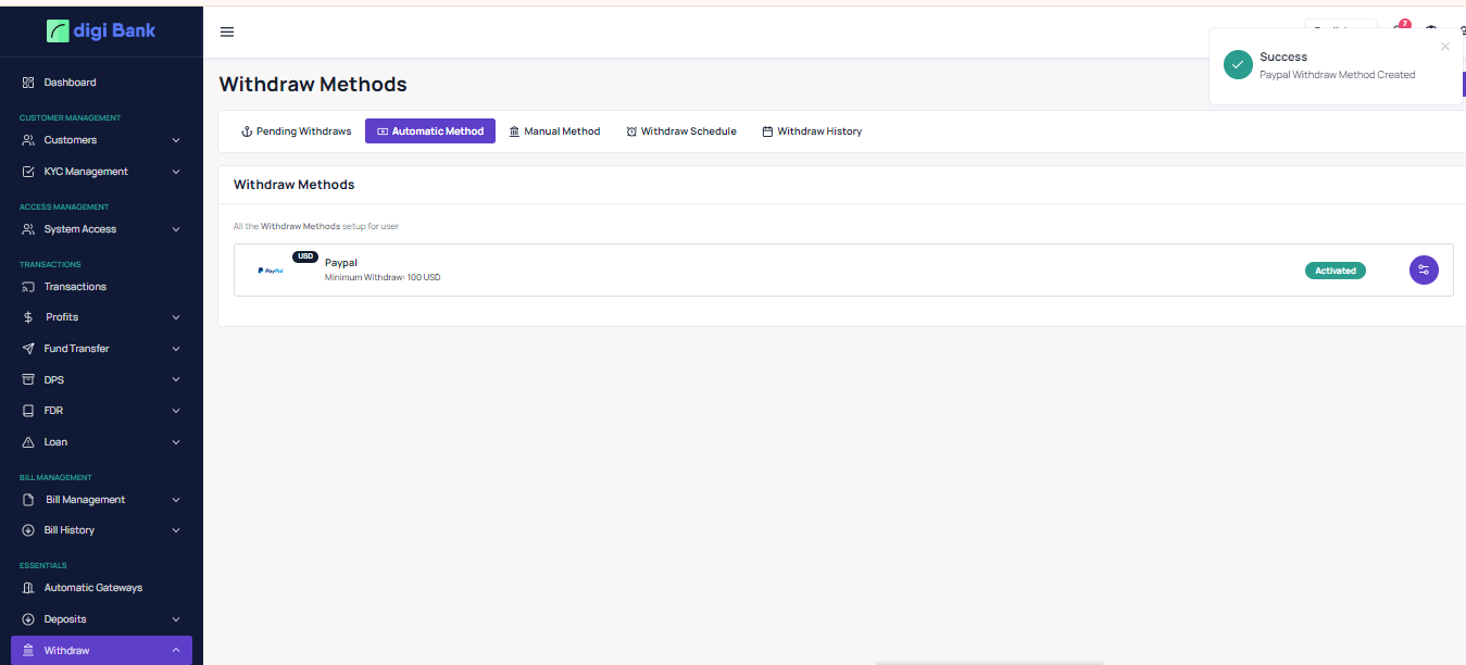 automatic withdrawal method to withdraw the money to the user account directly. It has a manual