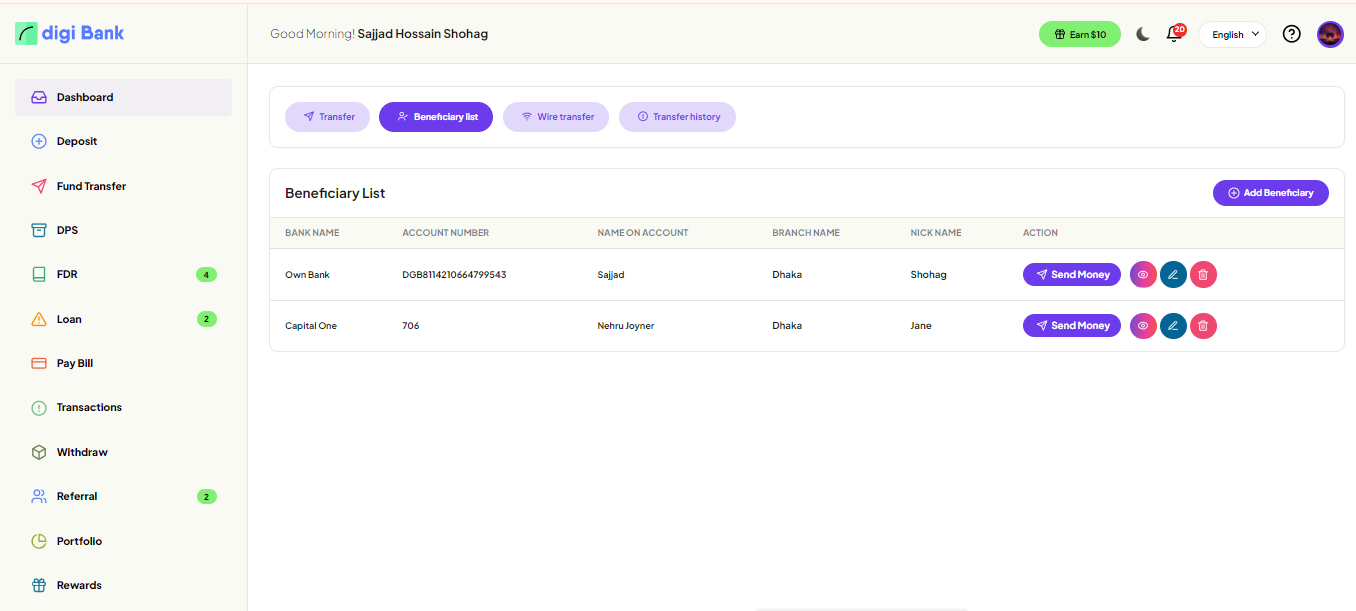 User can add,edit,view,send money beneficiary from Beneficiary List Menu.