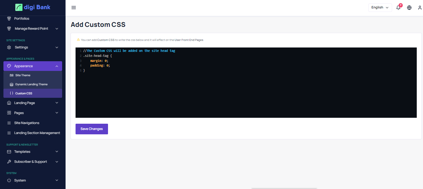 Admin can add custom CSS code from this menu.