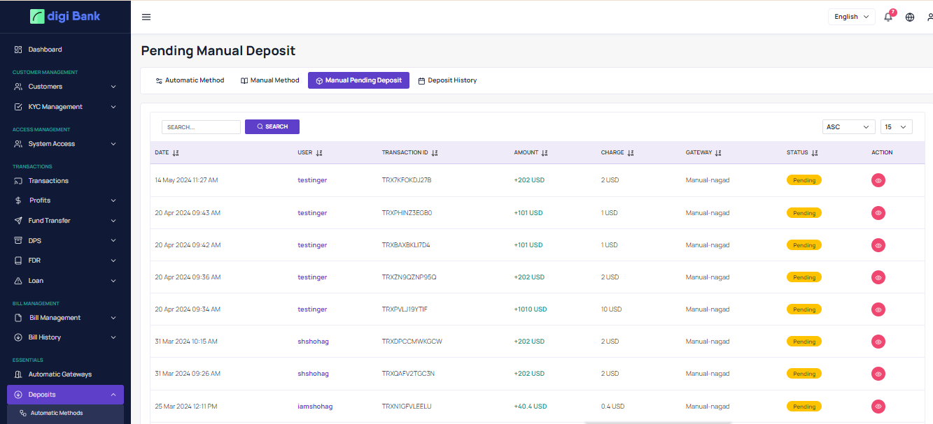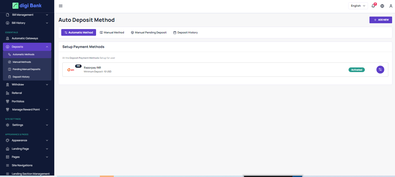 User can deposit from here using any automatic or manual deposit method.