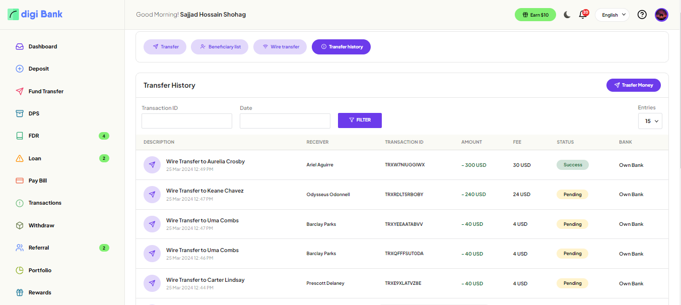 User can see the fund transfer history here.