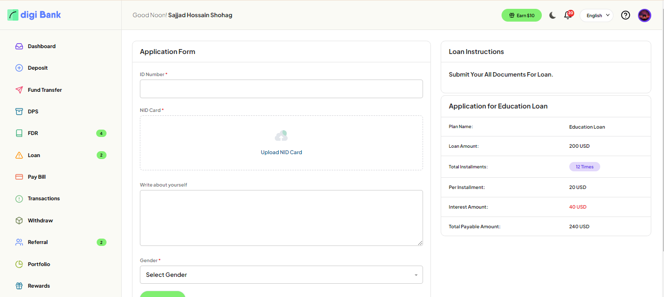 In the loan application page, Submit all loan required documents and information.