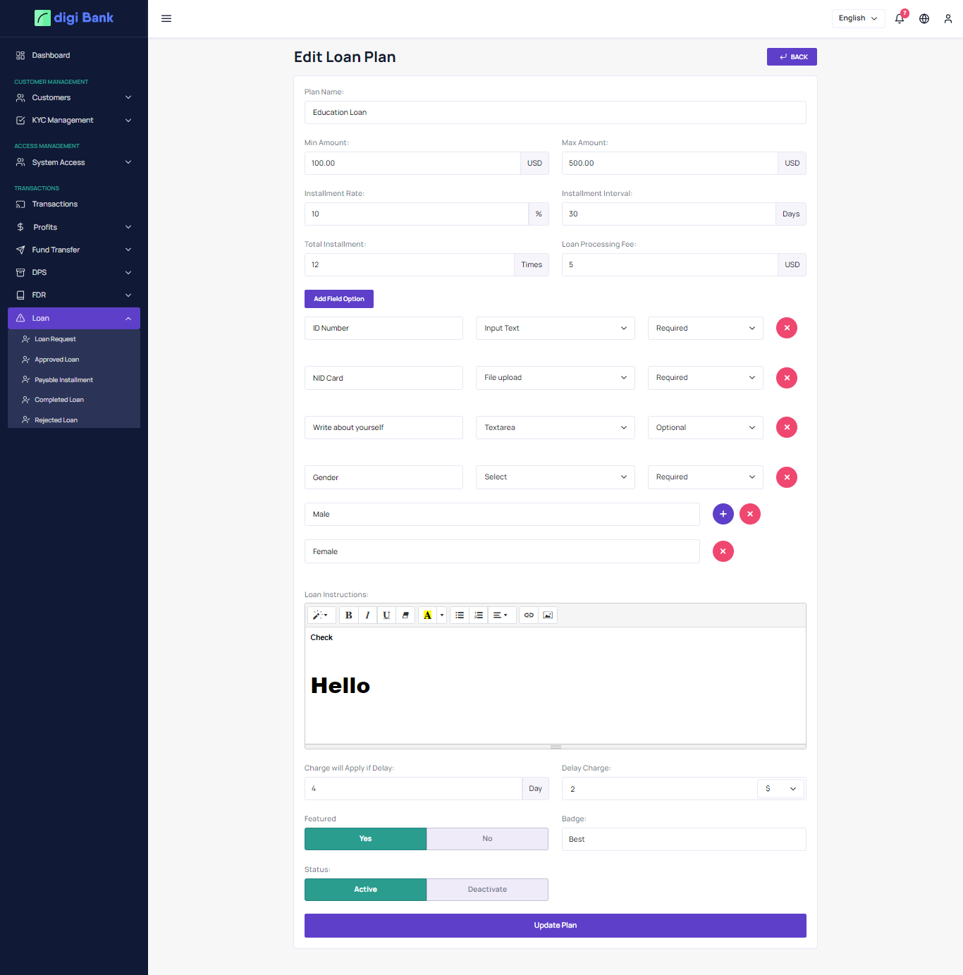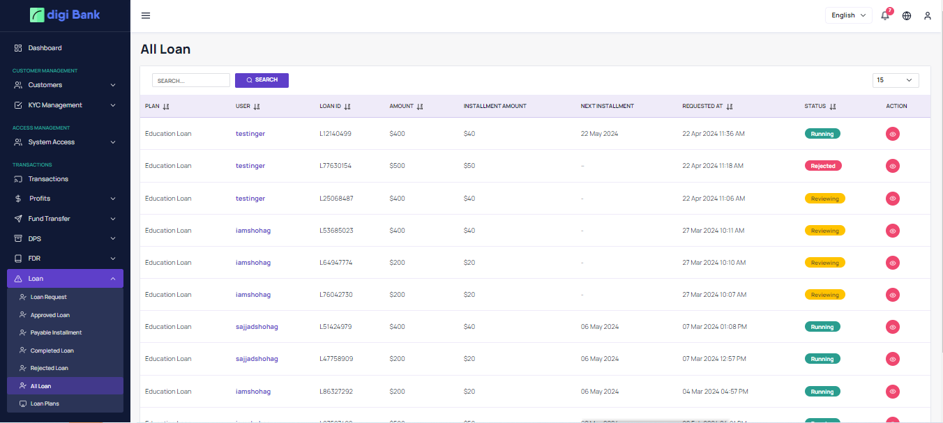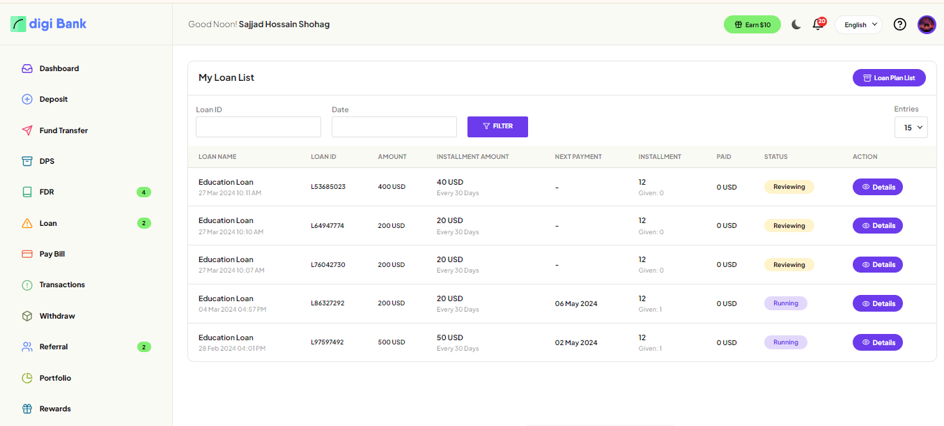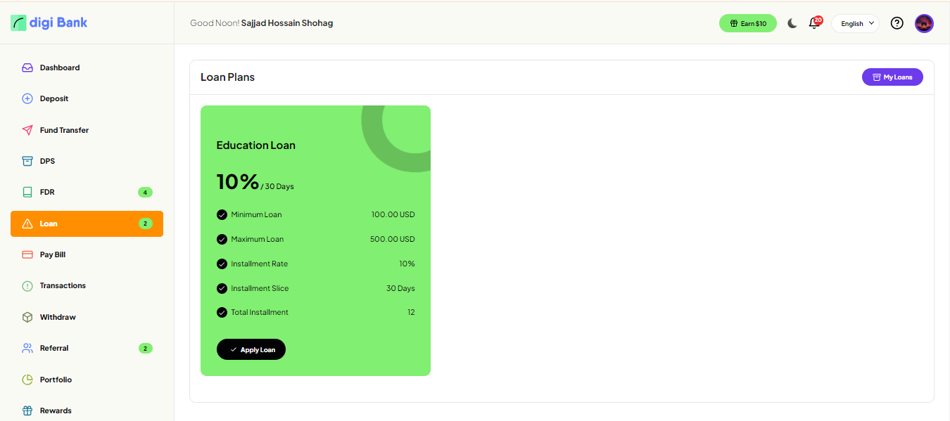 User can see all active loan plan and apply.