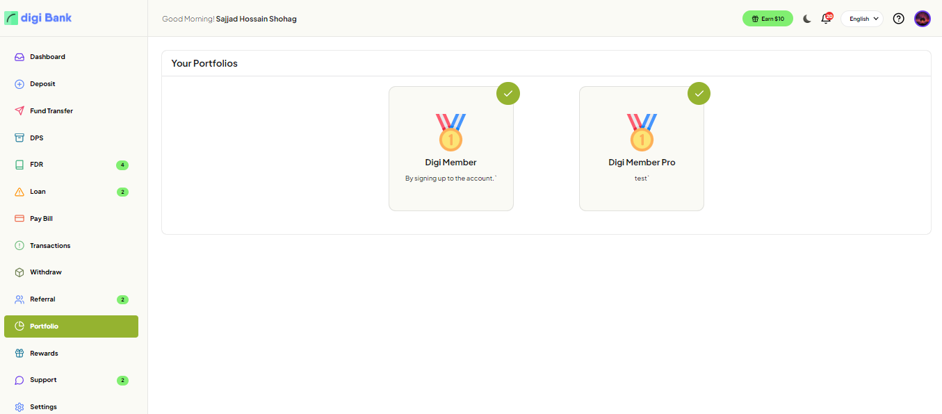 this page, users can also see the Portfolio Badge and Account Balance with recent