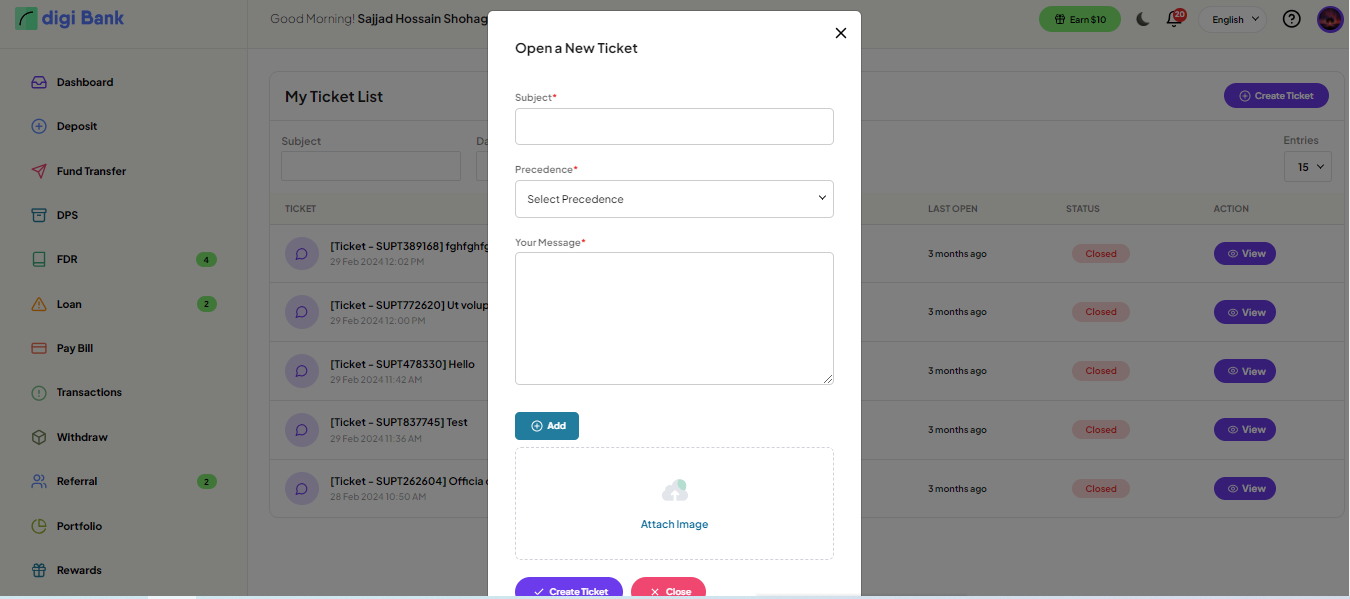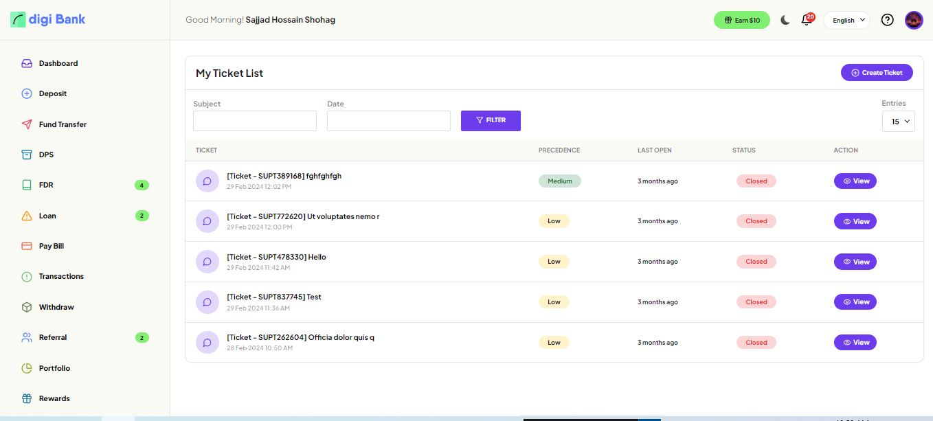 User can create a support ticket from here and can communicate with the admin directly.