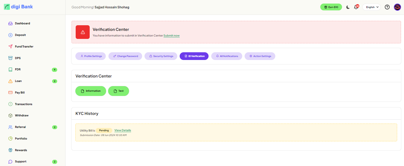 In the ID Verification page, User can see kyc history and submit kyc.
