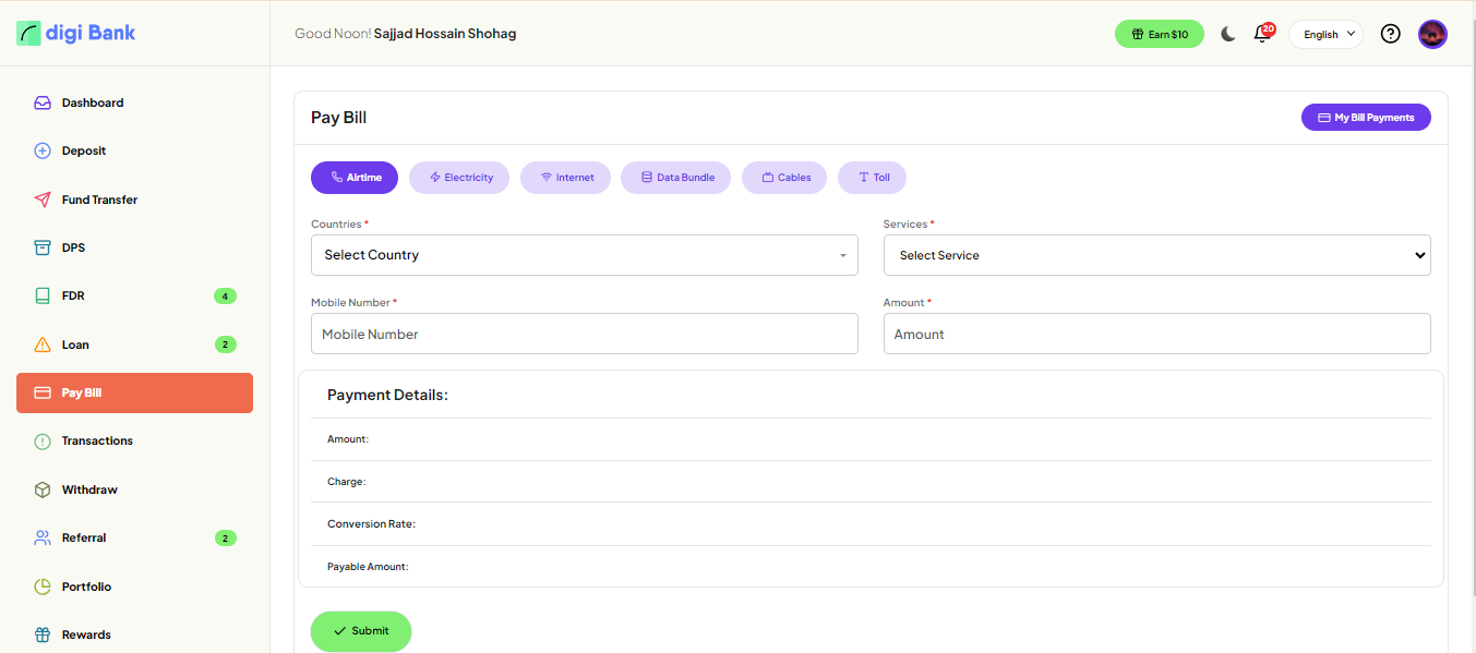 User can pay bill. Airtime, Electricity, Internet, Data Bundle, Cables, Toll.