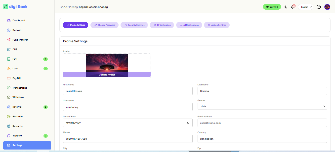 In the settings page, user can edit and update all informations. Also, Change Password and