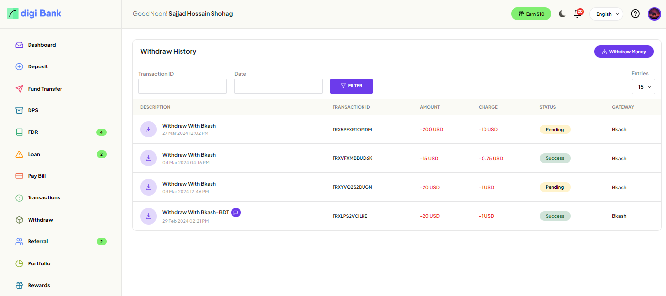 User can explore all the Withdraw history here